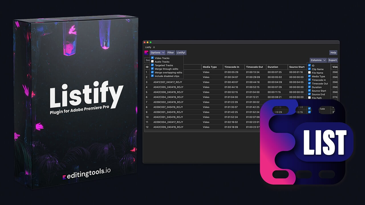 Listify is the number one plugin for Adobe Premiere Pro to create VFX sheets, ADR lists, music cue sheets, stock video lists and more. It is easy to use and offers a variety of filter and export options to create custom csv and pdf files.