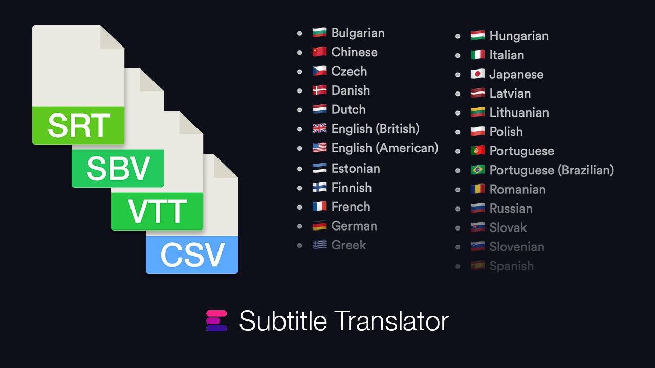 Oversett undertekstfiler ved hjelp av det beste nevrale nettverket for oversettelse. Støtter undertekstformater som SRT, VTT, SBV, CSV og mange flere. Du kan også massebehandle og automatisere oversettelsen av hundrevis av undertekstfiler til flere språk samtidig.